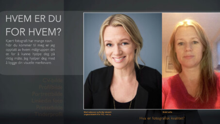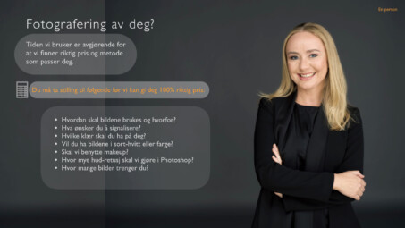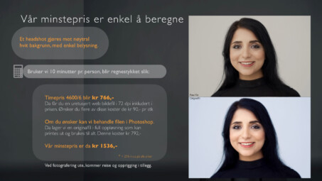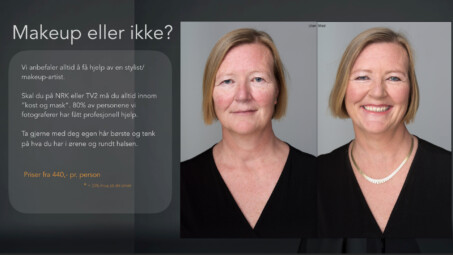 Det handler også om valg av bildestil, makeup og hvor mye etterarbeid vi skal gjøre. Vi hjelper dere å fremstå troverdige på en tillitsfull måte, som gjøre det lettere å «selge» dere videre til egne og nye kunder. Liker du blikket og glimtet i øynene på bildene du ser? Ring oss om svaret er JA!